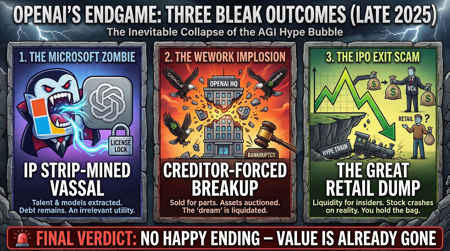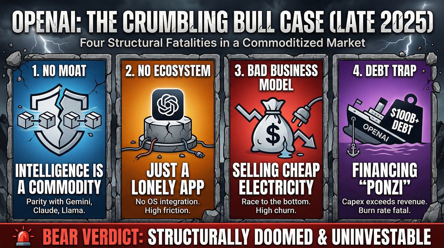 The comparison to Netscape is instructive. Netscape proved that the internet was real and created genuine value, but it had no sustainable moat against an incumbent who could bundle the browser directly into the operating system. OpenAI has proven that large language models are real and valuable, but it faces the same structural disadvantage against incumbents who can bundle AI directly into operating systems, productivity suites, and cloud platforms. The value will accrue to the companies that own the distribution channels and the hardware, not to the company that demonstrated the technology was possible. OpenAI is destined to become a historical footnote, remembered as the company that ignited the AI revolution but failed to capture the economic value it created.